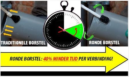 Met de ronde borstel kunt u de PVC lijm eenvoudig en snel aanbrengen. Daarnaast zorgt de borstel voor een goede gelijkmatige verdeling van de lijm en daarmee voor een betrouwbare verbinding. Deze borstel bespaart u per verbinding 40% van uw tijd ten opzichte van de traditionele platte kwast!
