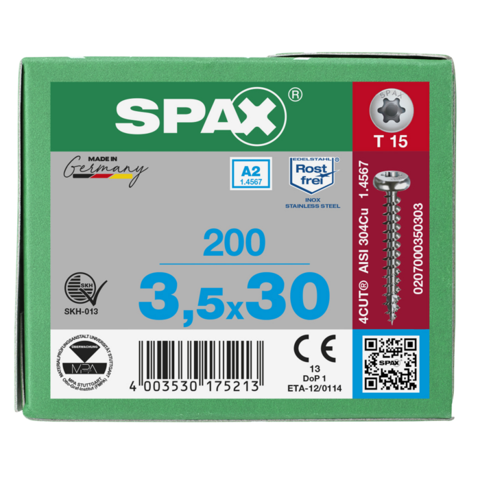 Spax spaanplaatschroeven T15 cilinderkop RVS A2 3.5 x 30 mm voldraad 200 stuks