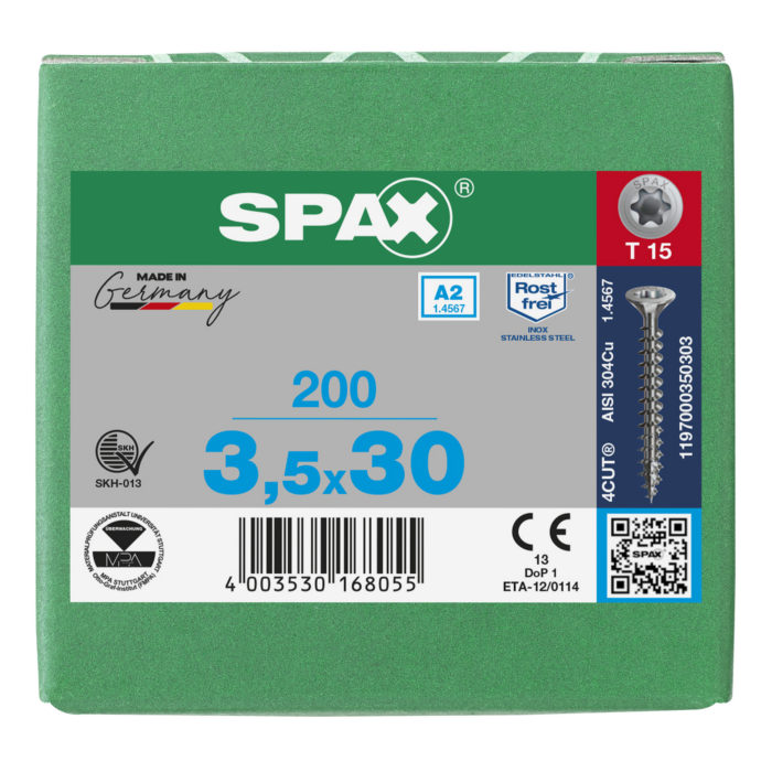 Spax spaanplaatschroeven T15 RVS A2 3.5 x 30 mm mm voldraad 200 stuks