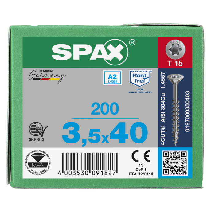 Spax spaanplaatschroeven T15 RVS A2 3.5 x 40 mm deeldraad 200 stuks