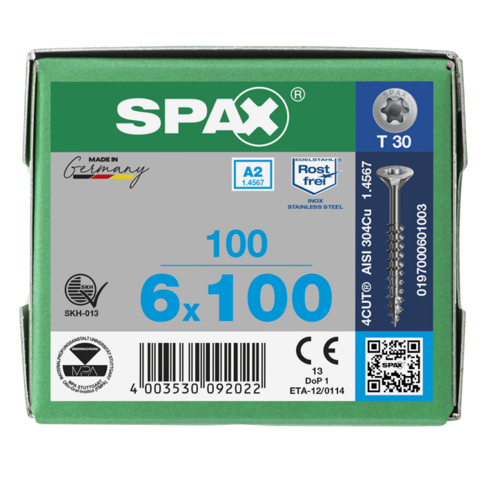 Spax spaanplaatschroeven T30 RVS A2 6 x 100 mm deeldraad 100 stuks