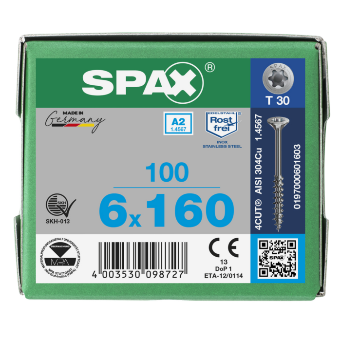 Spax spaanplaatschroeven T30 RVS A2 6 x 160 mm deeldraad 100 stuks