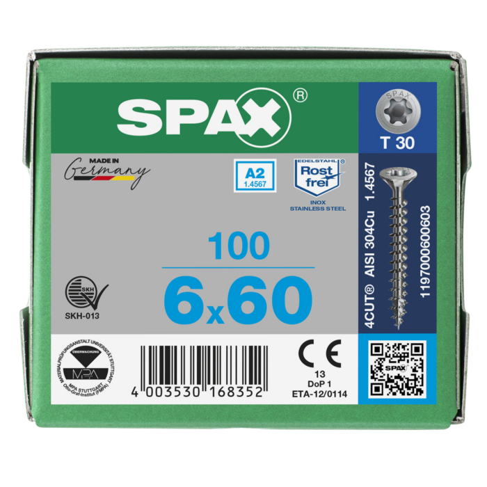Spax spaanplaatschroeven T30 RVS A2 6 x 60 mm voldraad 100 stuks